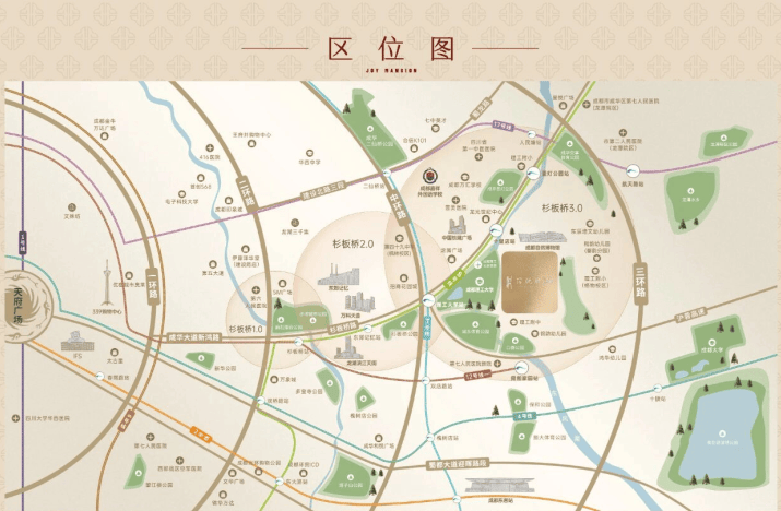 信悦府坐落于"金色中环"与杉板桥板块的核心交汇处,不仅是城市更新战略的重点实施区域,更巧妙平衡了主城繁华与低密舒适的生活需求。作为成都"中优"战略的重要承载区,东中环区域正聚焦于主城更新与价值重塑,而"金色中环"作为城市核心发展带,汇聚了交通、文化、居住等多重城市功能。