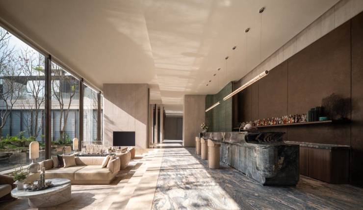 甄选沙漠风石材、爱马仕旗舰店同款玻璃砖墙等,诠释成都招商玺对"材质原生美"的坚持,更注重于材质的经典性。