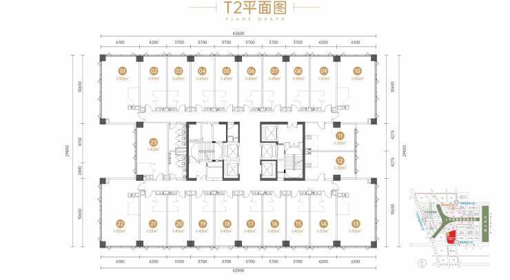 面积区间上,T2栋为45 - 92 ㎡(主力45 ㎡) ,T3栋整售,单层面积T2栋1278 ㎡,T3栋1352 ㎡。