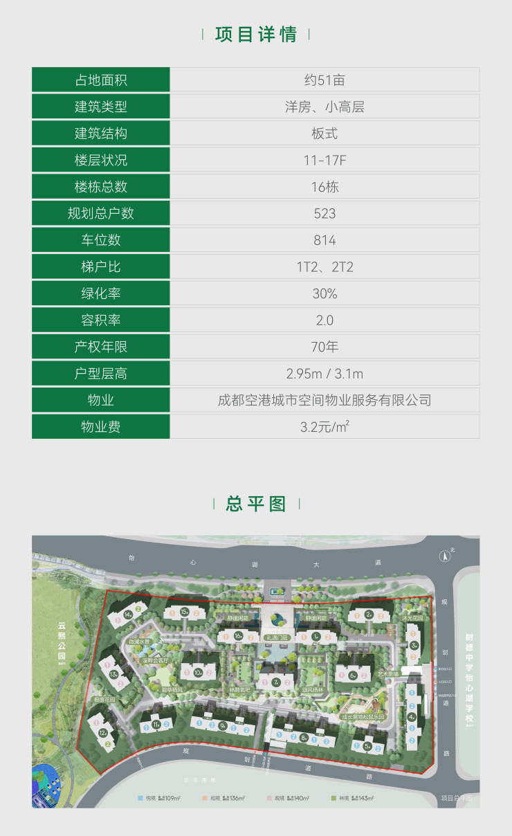 项目紧邻约500亩怡心湖主湖区,坐享云熙公园、体育公园等多座大型城市公园环抱,以2.0低容积率与板式建筑结构,打造建面约109-143㎡的精装华宅。