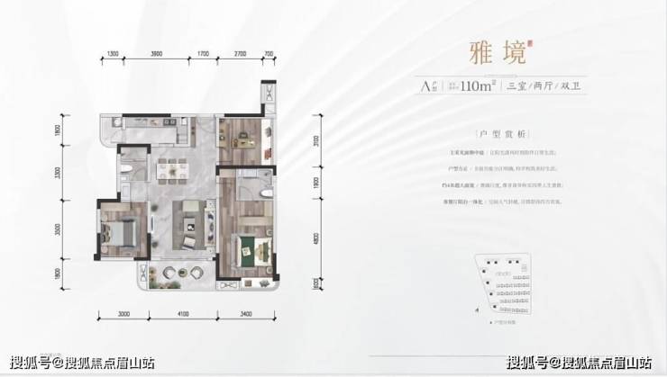 ?小高层户型:清水交付1、T3楼栋:14-17F舒适层高2梯3户;南北朝向;公摊18.0%【A雅境】:建面约110㎡,三房两厅两卫