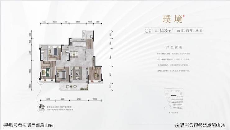 T2楼栋:中庭楼王(清水)?层高:16层、梯户比:2梯2户;板式布局⛩层高3.15米、一楼4.5米架空?公摊20.8%(全四房户型)【C璞静】:建面约143㎡,四房两厅两卫