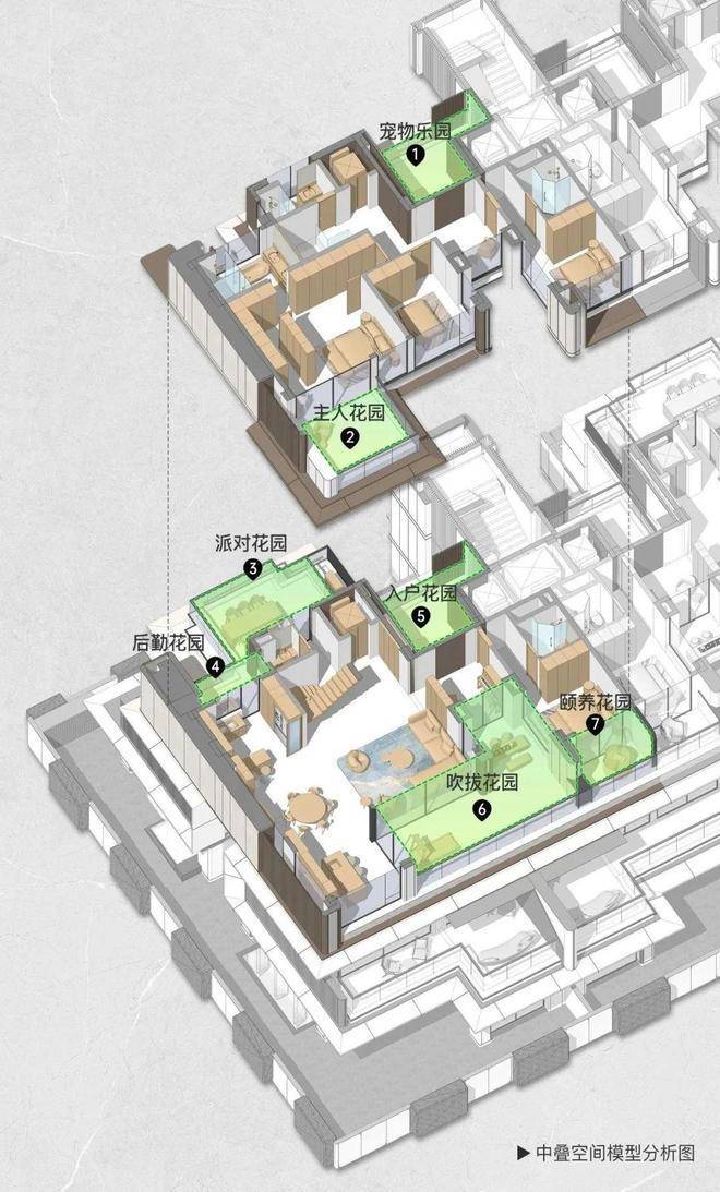 中叠户型的亮点:15.4米的超级面宽,极大提升了中叠上叠的舒适度;2.中叠拥有7个花园空间,在入户、客厅、厨房、主卧等主要空间都有花园作为连接;空中庭院。