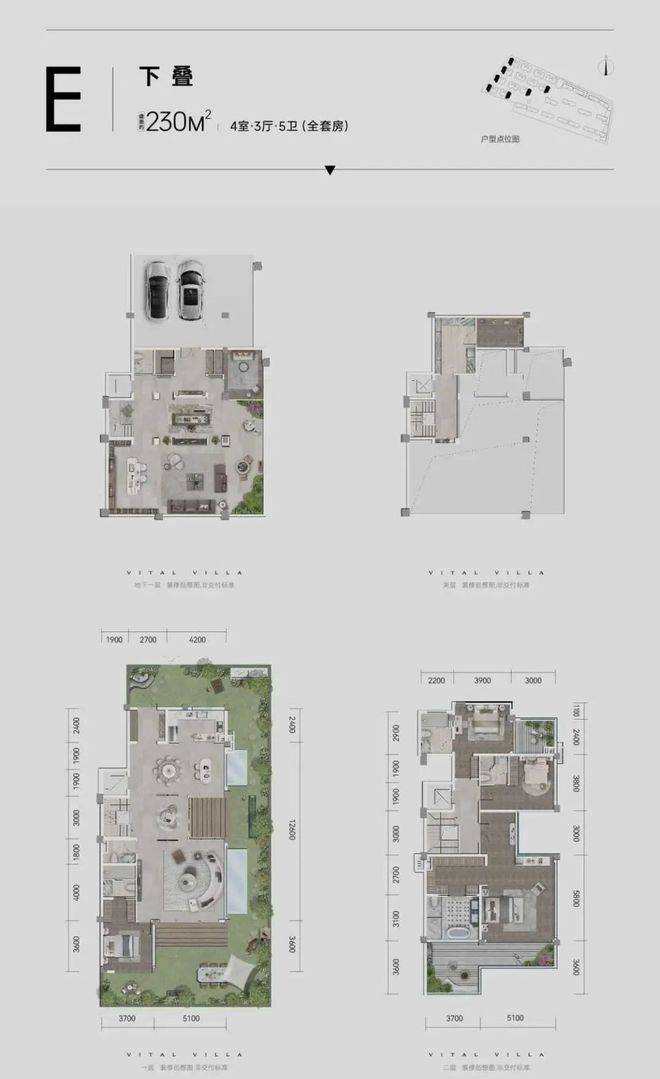核心特色:采用层层退台的立体建筑形制,实现“一墅最多七花园”的环绕式景观。通过上叠的屋顶花园、中叠的退台露台、下叠的私家庭院与独立地下室,构建出从地面到空中的三维立体生活空间。