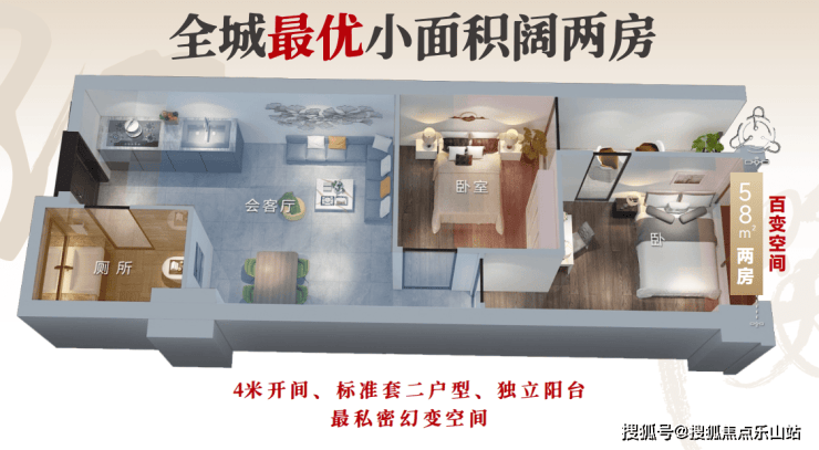 58㎡百变套二:4 米开间标准套二,带独立阳台,私密幻变空间,满足小家庭居住;