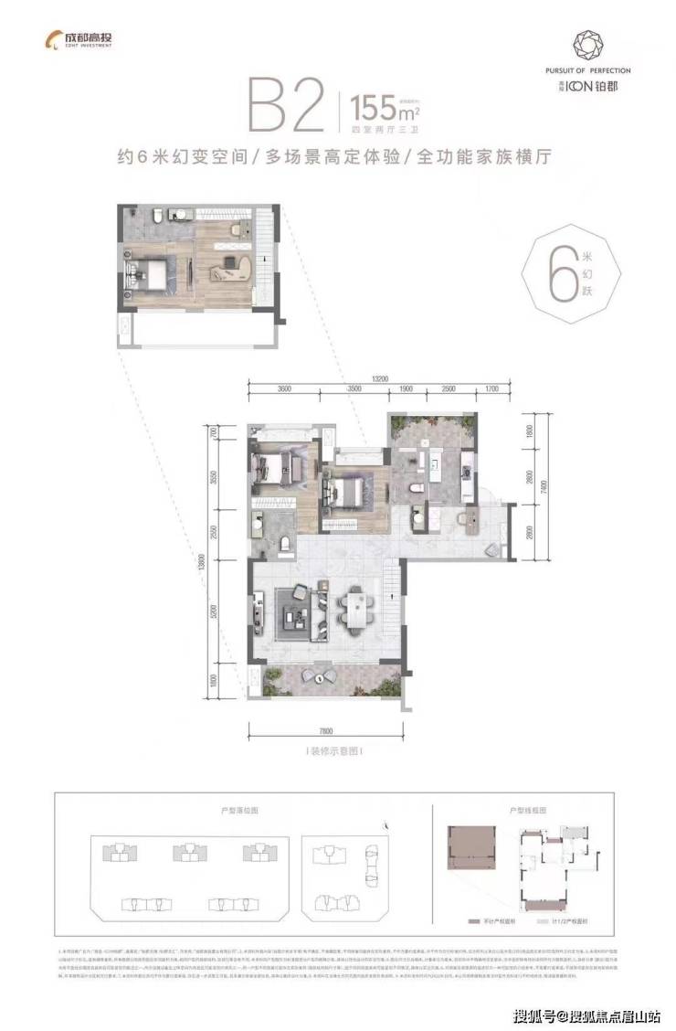 B2建筑面积约155㎡,实得面积约210㎡客厅6米挑高,超大空间分区配置,跃层独立私密主卧豪华套房,南北双阳台通透采光,近8m双观景阳台享无敌视野。