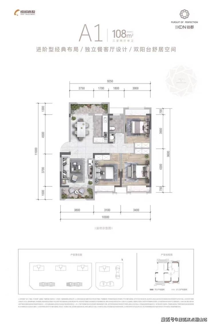 A1 建筑面积约108㎡ 10层低密度洋房平层,1梯2户南北通透,动静分区,双阳台设计,高端精致三房。