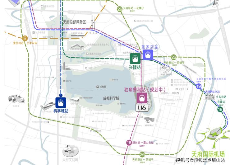 轨道交通:18号线兴隆站、16号线成都科创生态岛站(预计2024年开工)、19号线蓝家店站、天府新站(在建中)纵横路网:科学城北路、科学城中路、天府大道、梓州大道、蓉遵高速、益州大道国际机场 :天府国际机场(约30km, 18号线3站即达 ) 、双流国际机场(约25km, 19号线7站即达 )