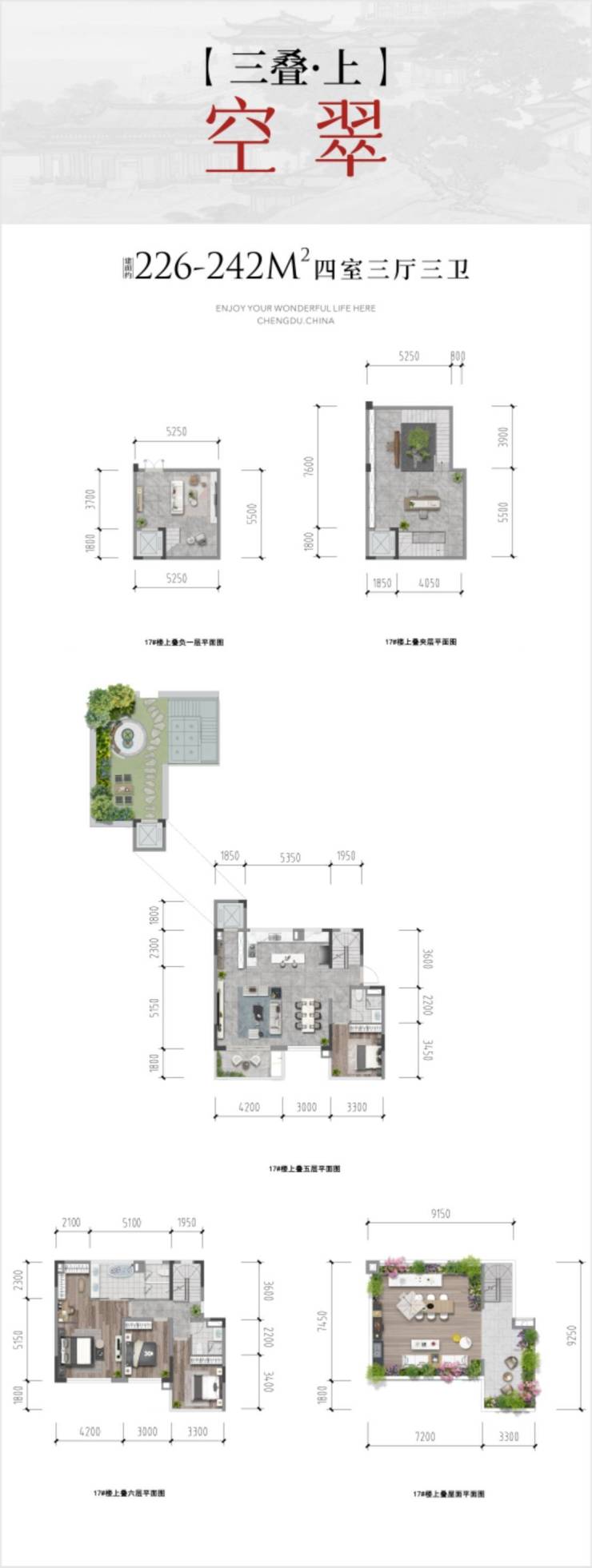上叠226-242㎡(空翠),500-590万,1楼花园20多。屋顶80多平