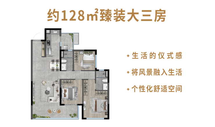 【自由与舒享 约128㎡臻装大三房】l独立玄关,多功能收纳l动静分区设计,生活自如lL型厨房连接生活阳台l南北全通透,阔景双阳台l约32㎡南向大面宽客餐厅l奢阔大三房,舒居尺度空间