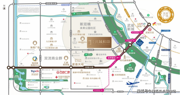 武侯大道到双楠大道的两侧分布了各类城市级商业体:大悦城、吾悦广场、武侯万达、山姆会员商店(武侯店)、时代奥特莱斯、星荟天地、双流万达、城南优品道、海滨城。本案约1.5公里范围内教育丰富,有九江新城初级中学、九江新城小学、九江蛟龙幼儿园。区域还有规划中的双流实验小学。而双流本是教育强区,在本案约5.5公里范围内,有四川省重点中学双流中学,和连续五届荣获“中国百强中学”的棠湖中学。