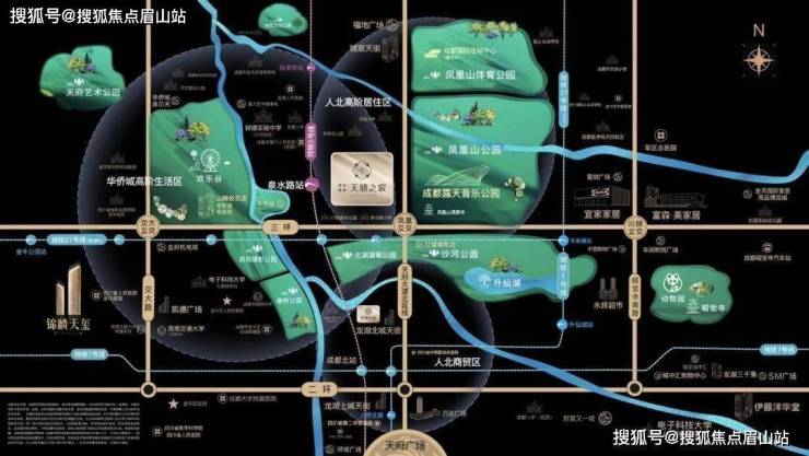 在项目周边两公里范围内就有数座大型生态公园:约655亩的凤凰山公园、约593亩成都露天音乐公园、沙河公园、北湖凝翠公园、沙河源公园、府河摄影公园、天府文化艺术公园、体育文创公园等,合计总占地面积约8000亩。