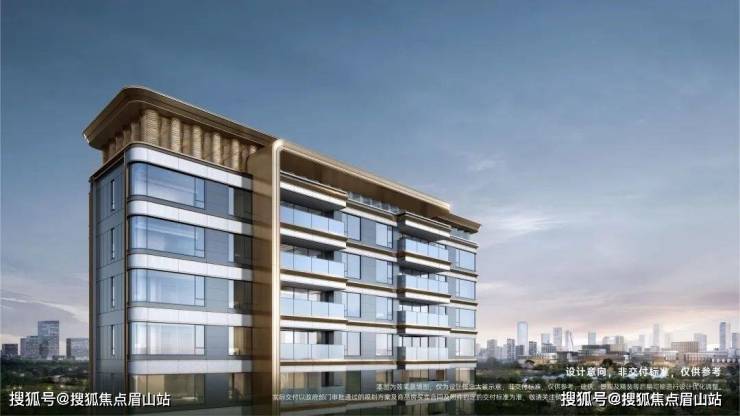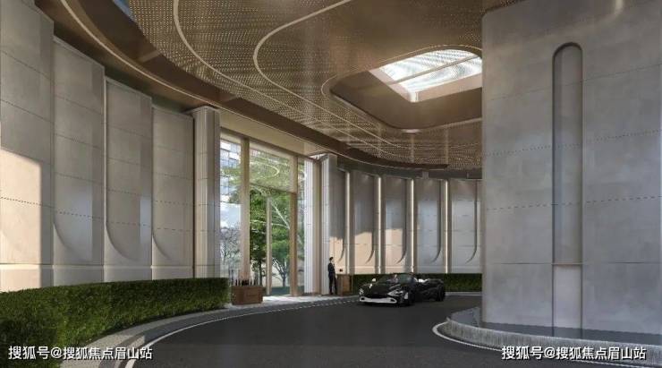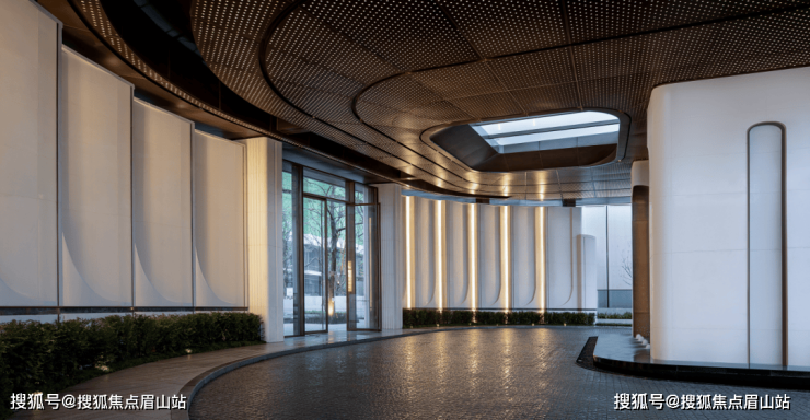 此外还有一些设计小细节,如礼器式转角曲面在卧室或端厅上的运用,星光穿孔幕墙的创新,入户门头的局部石材+香槟金铝板+大面积玻璃设计等,整体营造轻奢“爵系”质感,打造超现代流线美学立面。