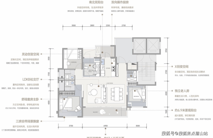 【LDKB社交厅】约6.9米大面宽客餐厅与厨房、阳台无界连通