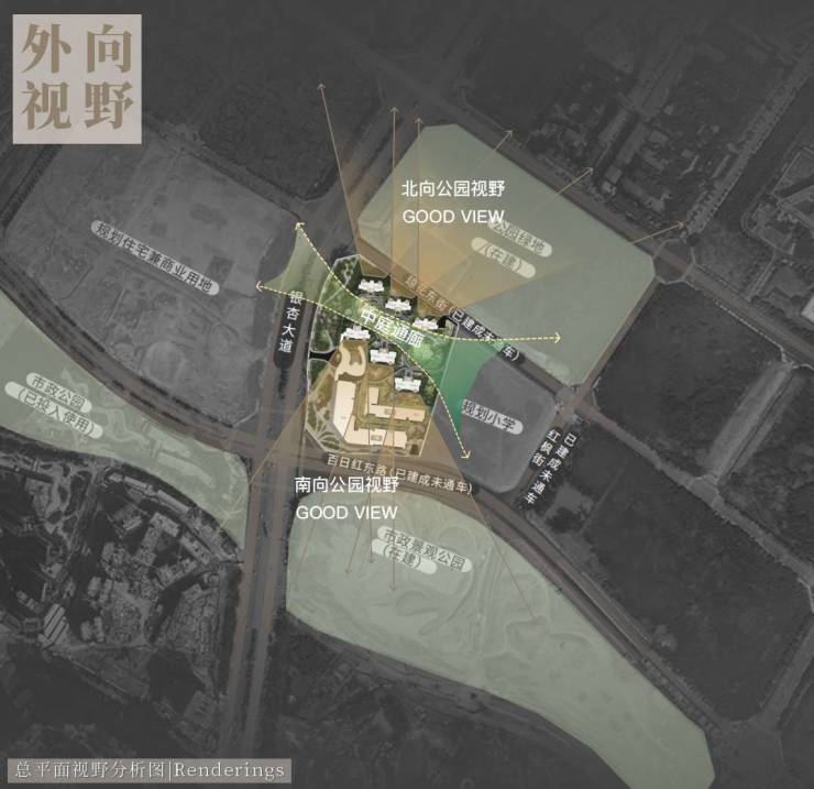1-3号享受超阔景观中庭视野,最高楼间距超60米;4-5号楼外看公园
