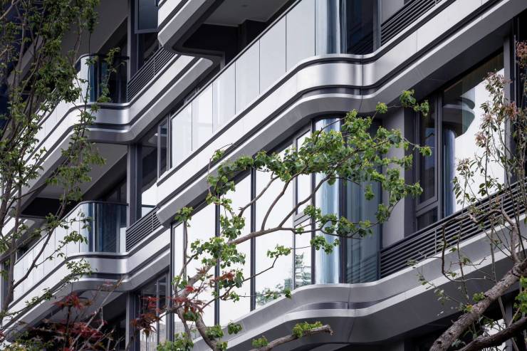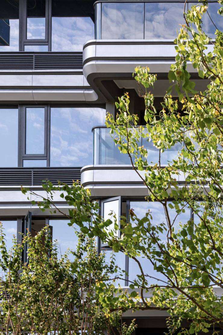 几乎全覆盖、且精挑光幕玻璃,让立面反射天空颜色,光影之间构筑建筑天际线。通透宝石玻璃立面,让仰望星空成为阳台风景日常