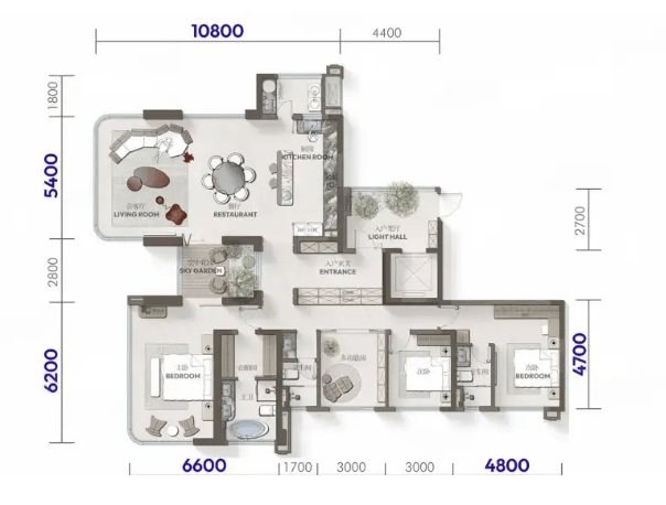 创新园林布局:采用围合式布局,打造三重景观中庭,并通过64-240米超宽楼间距的设计,确保户户观景无遮挡,极大提升了居住的私密性与视觉舒适度。