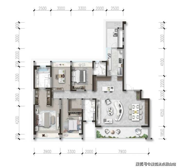 四室两厅三卫,板式结构,约16.1米的极致南向采光面、双阳台设计让空气对流与四季瞰景,都变得无比自然。