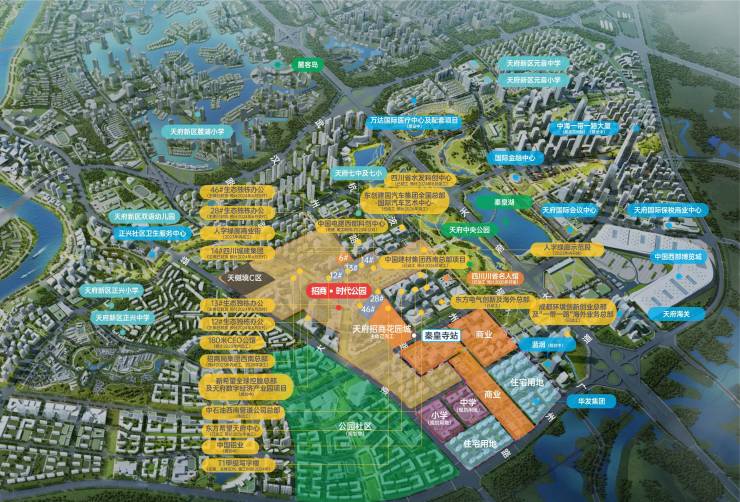 天府总部商务区天府总部商务区以公园城市为设计理念,总体设计28.6平方公里,中央核心区范围8.5平方公里。区域突出总部经济聚能和高端服务赋能,构建以总部经济为核心引领,形成多元产业体系,打造面向世界的中央商务区、成都未来城市新中心。招商时代公园,位于天府总部商务区中心区域。