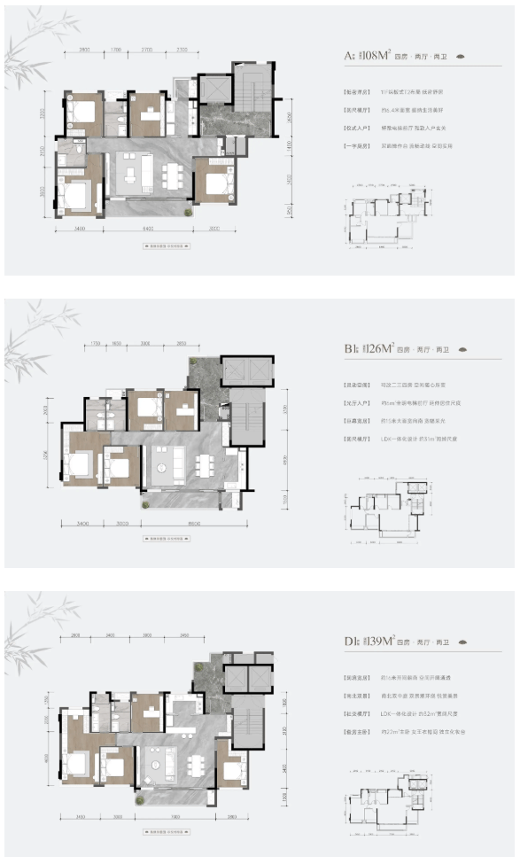 项目三大主力户型均以四房功能为核心,通过精细化设计,在不同面积段内实现空间利用率与居住舒适度的最大化。