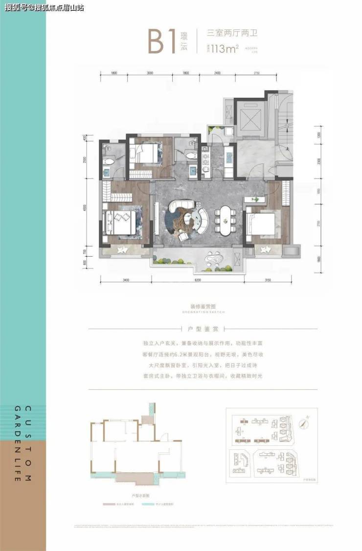 建面约113㎡的套三。