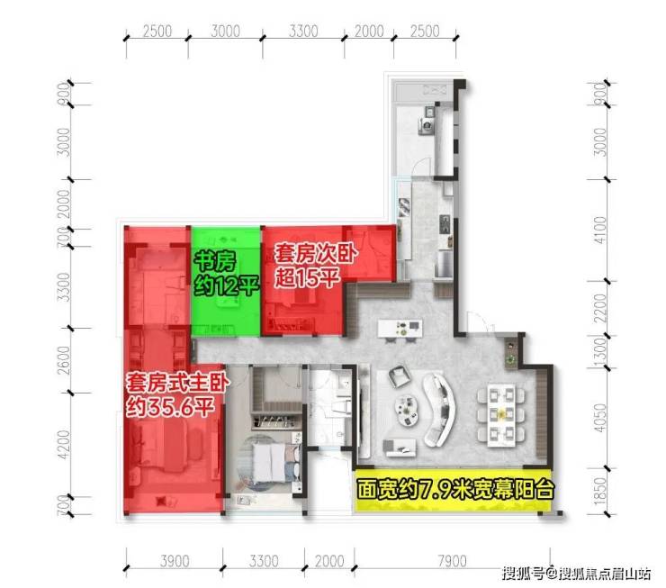 从得房来看,进深约1.85米的景观阳台计一半产权,4间飘窗不计产权;且4间飘窗分离出一些X多功能区域,可储物、改造,让整个户型得房甚为可观。