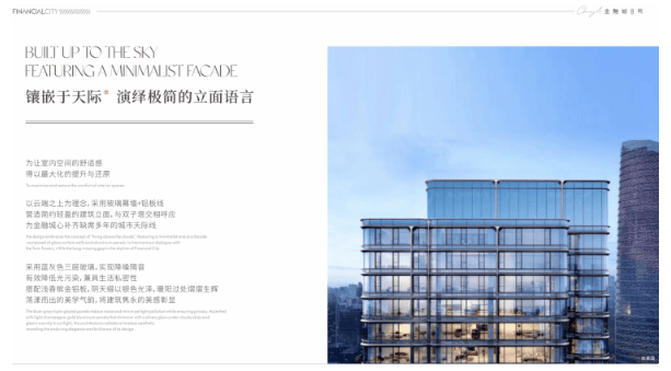 作为金融城一期罕见的纯高端住宅,项目以约27亩的占地面积,规划了4栋约160米的超高层塔楼集群。其中,住宅产品仅占据一栋,通过极致的规划确保了圈层的绝对纯粹与视野的无可匹敌。