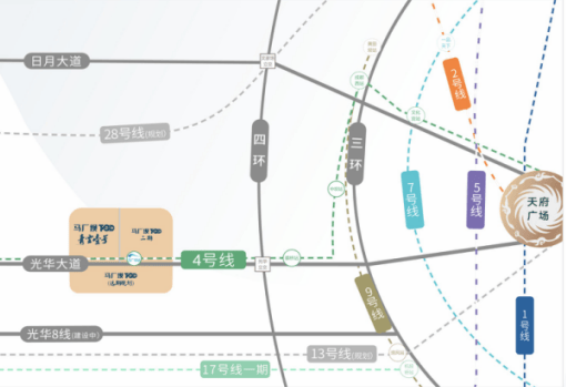 三横一环:日月大道、光华大道、光华8线快速路与四环横纵交汇,快速通达全城。