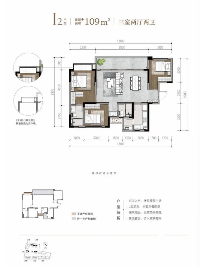 此户型为舒适升级之选,相比89㎡户型,空间尺度更为宽敞。三房两卫的设计完全满足三口或四口之家的舒适居住需求,在主城核心区属于功能与舒适度兼备的实用型产品。