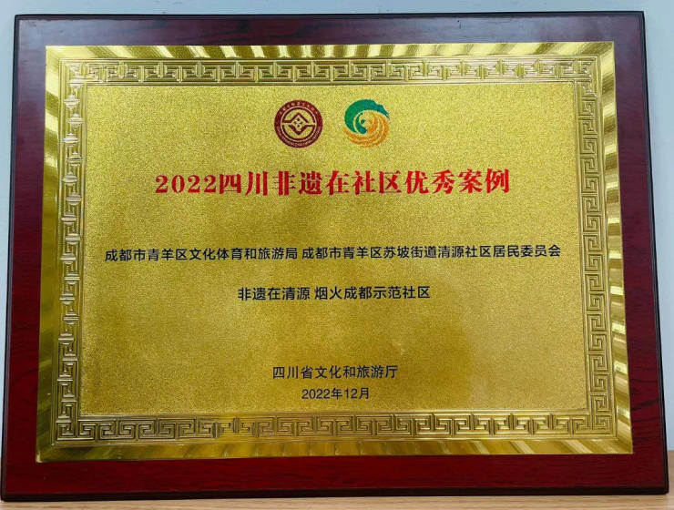 清源社区作为传承中国传统文化的全国性示范社区,全国第三!全川第一!并获得四川省文化和旅游厅“非遗在清源,烟火成都示范社区”获得2022年四川省“非遗在社区十大优秀案例”!