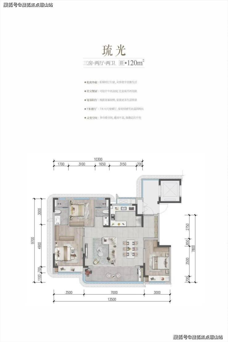 首先,开间7米的客餐厅与景观阳台,一般达到这个尺寸的120平户型,客厅进深可能在4米左右,但这个户型进深达到了4.9米,足够摆放家具。
