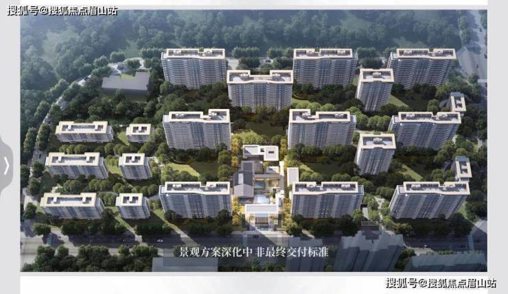 地块呈一个五边形,但整体比较方正。楼栋采用点阵列式+围合式布局,呈东高西低形态。