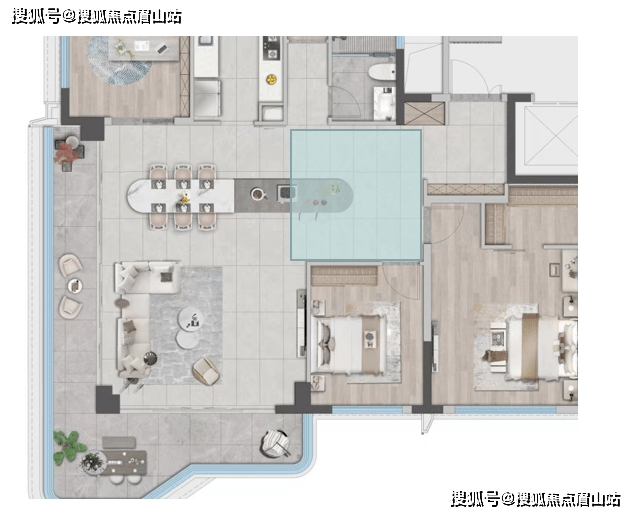 这样做的优点在于摒弃了一般端厅户型入户后的长过道,将空间释放出来。并且老人房与主卧、儿童间隔较远,各有空间。