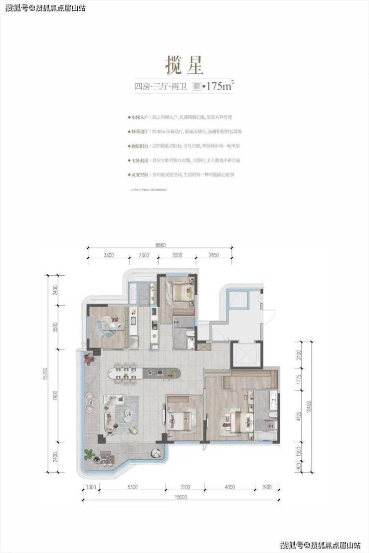 其次,端厅双面采光,近52平的空间,南向景观阳台6.6米,东向9.8米,整个空间感和采光度拉满。