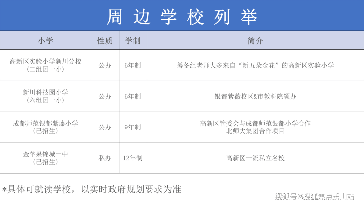 成都师范银都紫藤中学(南北校区),成都师范银都紫藤小学(南北校区)、高新区实验小学新川分校(成都新五朵金花之一),新川科技园小学(成都市教科院和银都紫藤联合打造),金苹果锦城一中、四川省教科院附属中学等
