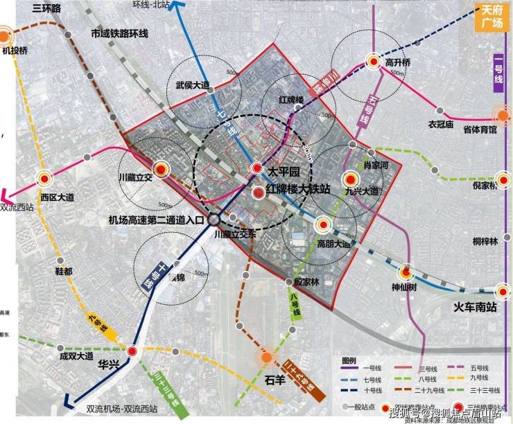 成都片区级TOD—三轨交汇聚太平园TOD太平园片区是是三国创意园产业功能区之一,太平园TOD项目设计研究范围达12平方公里,占地面积约1293亩,整体规划为一芯两轴两廊四片,一芯为太平园TOD核心,汇聚 3、7、10三条地铁交汇,贯穿全城的轨道交通枢纽区域,太平园TOD是成都市目前仅有的5个“三线换乘”TOD,还规划了主城第三座城市候机楼,未来将会成为成都主城的西南门户。