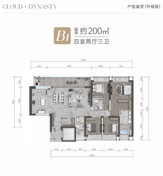 此面积段户型是项目的主力产品,定位为高端家庭的品质改善之选。户型设计强调功能性与舒适度的平衡,通常拥有开阔的横厅或巨幕景观阳台,主卧套房配置彰显尊崇。约169㎡的户型可实现舒适的四房功能,满足多代同堂的基本需求;而约200㎡的户型则能提供更奢阔的公共活动空间与房间尺度。