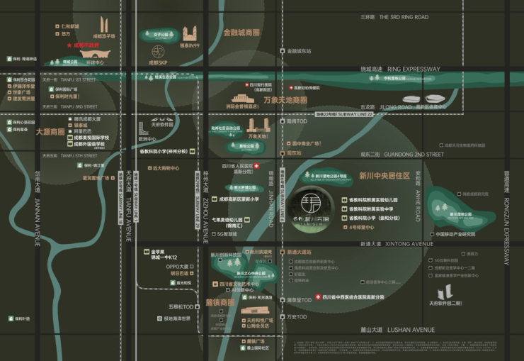 商业体系:3公里范围内汇聚万象天地(在建)、明日巴适等潮流商业体;7公里直达金融城-环球商圈,坐享SKP、银泰IN99等高端消费场所