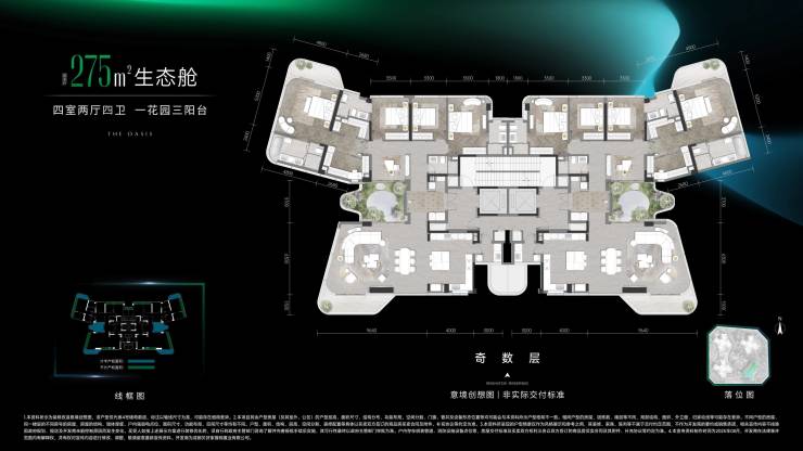 275平户型图:四室两厅四卫,一花园三阳台