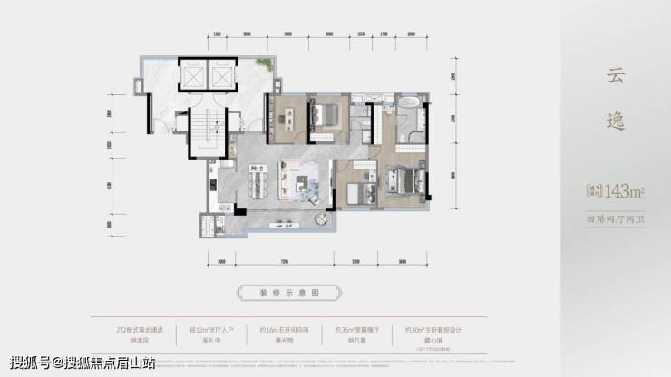 户型图2 梯 2 户 电梯入户 270 度光厅建面约125-143㎡套四