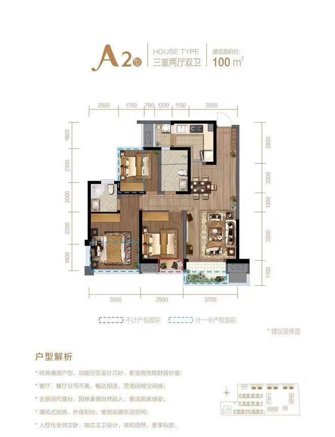 100-110㎡三室两厅双卫:经典通透户型,餐客分而不离,全景露台 + 通风式厨房,适配刚需改善;