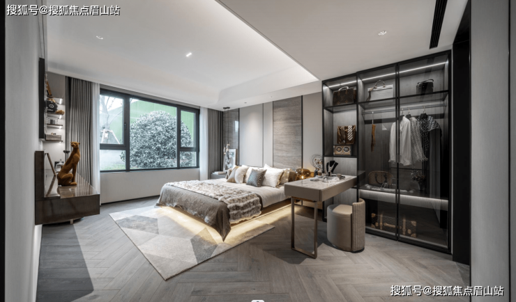 ?3.9m开间:主卧床前可放置 0.8 米宽的长桌,还留有 1 米宽松区域,可以是电视机/梳妆台/工作台,深夜足不出房实现办公,避免打扰家庭其他成员。