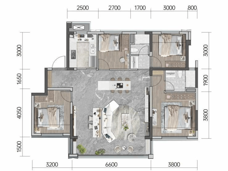 为了让家的每1㎡都体现其价值,就要减少一切面积浪费。方厅设计,用“功能区和交通空间共同逻辑”取代“传统的走道功能区逻辑”,因此,出现了所有房间均朝中心公共空间开门的布局。