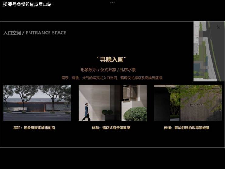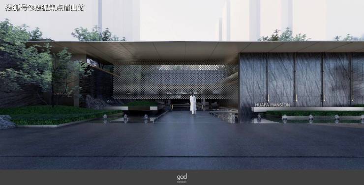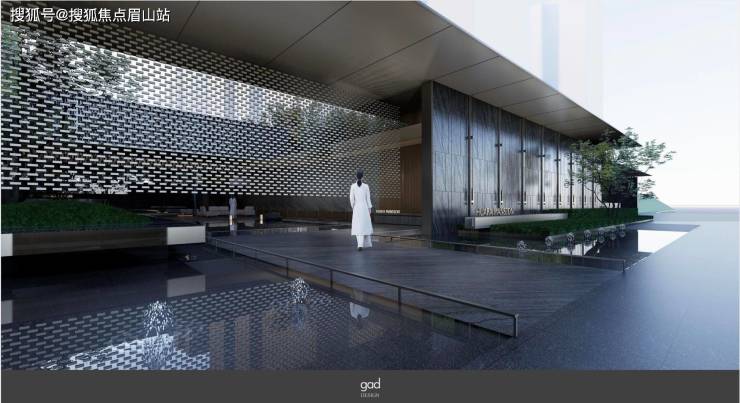 入口处延续锦江璞园的整体设计理念,以酒店化的设计手法,以蜀园为灵感,打造成落客、迎宾、大堂等多维度的归家景致。以墨玉藏金为整体色调,营造建筑典雅高级的气质。大堂主体采用超白玻,以轻巧的方式悬浮于水面之上,营造出建筑的当代感,大堂的表皮延续蜀地花砖的做法,以现代手法重现成都文化的精致感。如此城市级封面领域感,营造出专属的奢侈落客体验,可谓第一重“迎宾”。