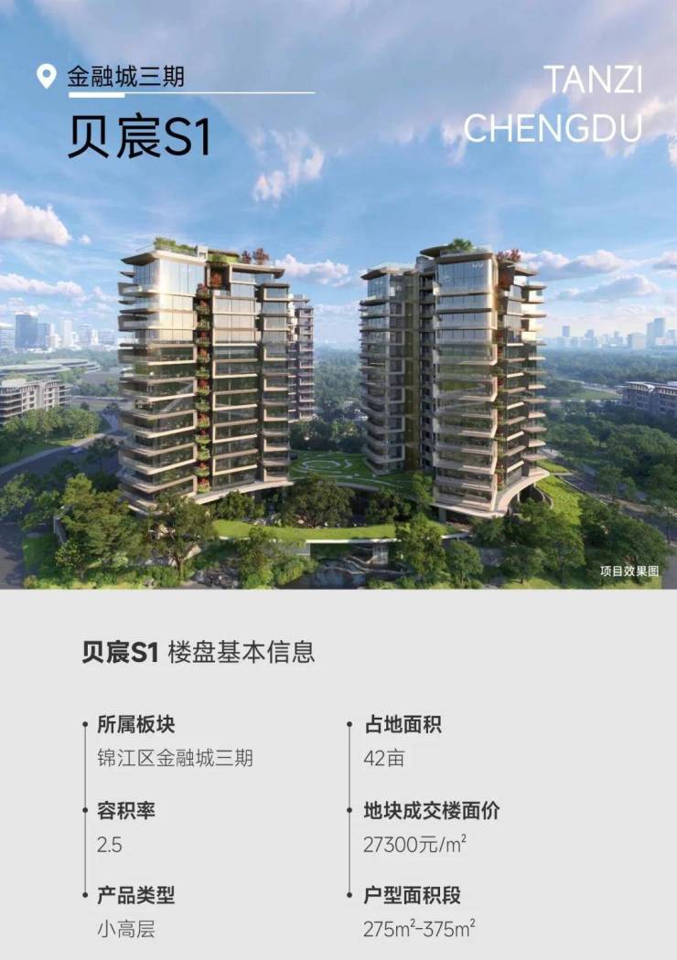 项目位于四川省成都金融城三期核心区,地块总面积约24亩,共规划了4栋15-16层的小高层住宅,采用围合式布局,套均面积超360㎡,最小户型约270㎡,总户数216户,机动车车位216个,绿地面积5523㎡,并配置400㎡全民健身场所。。