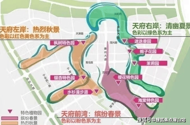 其中天府前湾将以粉色系为主,布局200亩樱花特色园、60亩海棠特色园;天府左岸以红黄色系为主,40亩银杏特色园、25亩枫林特色园、3公里水杉漫步道;天府右岸以绿色为主,茉莉园、栀子花园、迷迭香园。万亩绿肺环伺,实现真正的公园城市生活