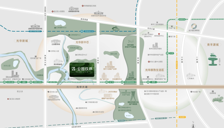 *沿光华大道贵脉,形成城西黄金主轴发展,在主轴两侧强劲吸附重要资源配套。