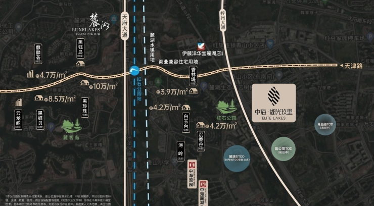 🏕 万亩生态:与红石公园一街之隔,麓湖生态区,天府森林公园、天府中央公园等近万亩绿肺环绕