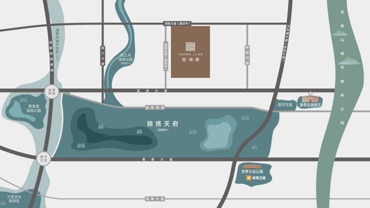 崑崙御x 拾光谷——高品质生活中心▶立于城市轴线之上东进主轴:崑崙御x 拾光谷立于东进主轴成洛大道之上,择址龙泉驿区副中心西河,为龙泉驿区规划“一心三极、两轴一带”的创新驱动极,发展丰富的产业园区,享成渝双城发展及成都东进双重红利。