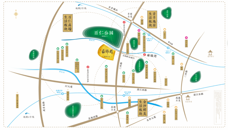 西贵宝地金沙板块核心位置,青羊区西三环外侧,苏坡立交和羊犀立交之间,属于成都政府重点打造的百仁高端生态居住区,紧邻1770亩百仁生态公园(相当于4个浣花溪大小)。